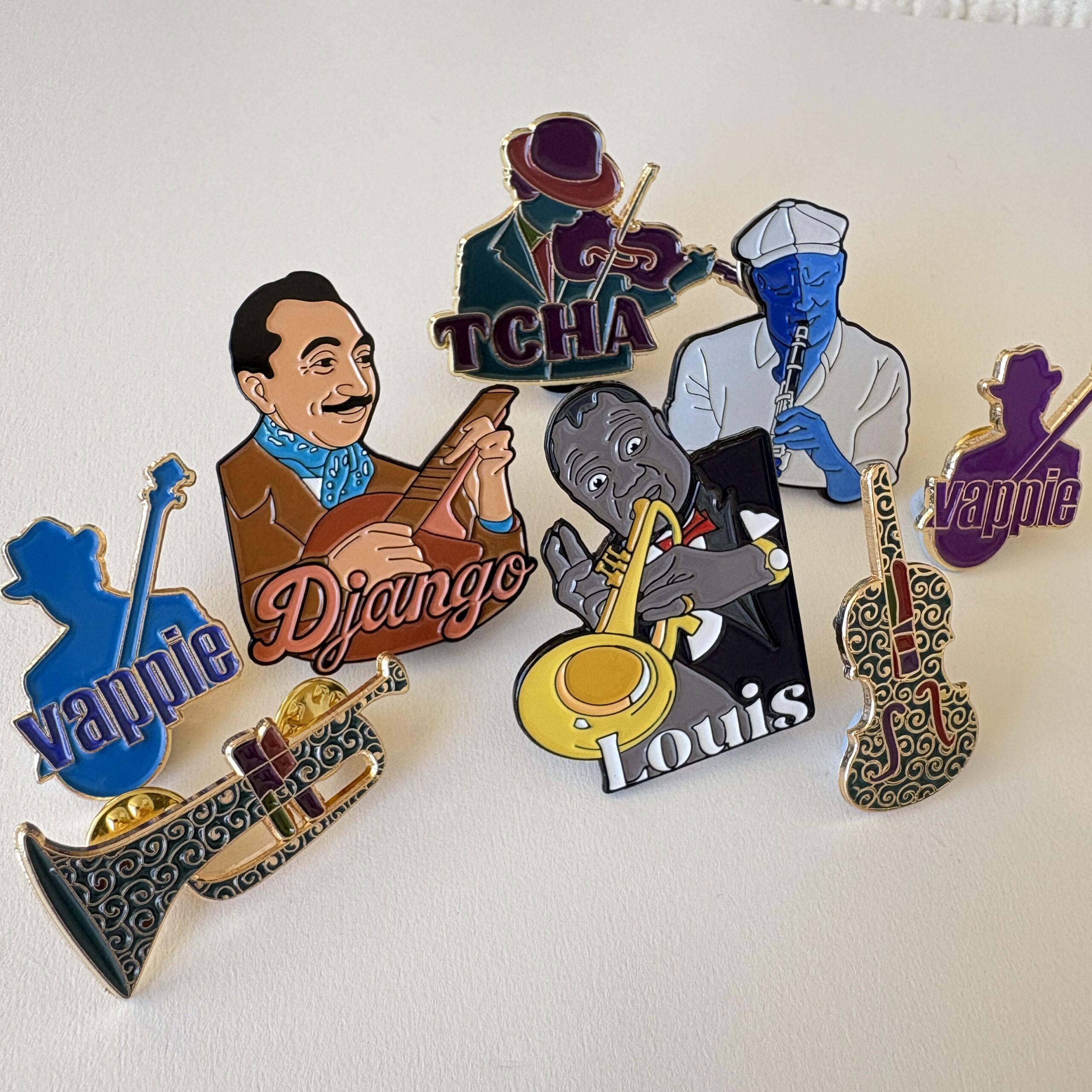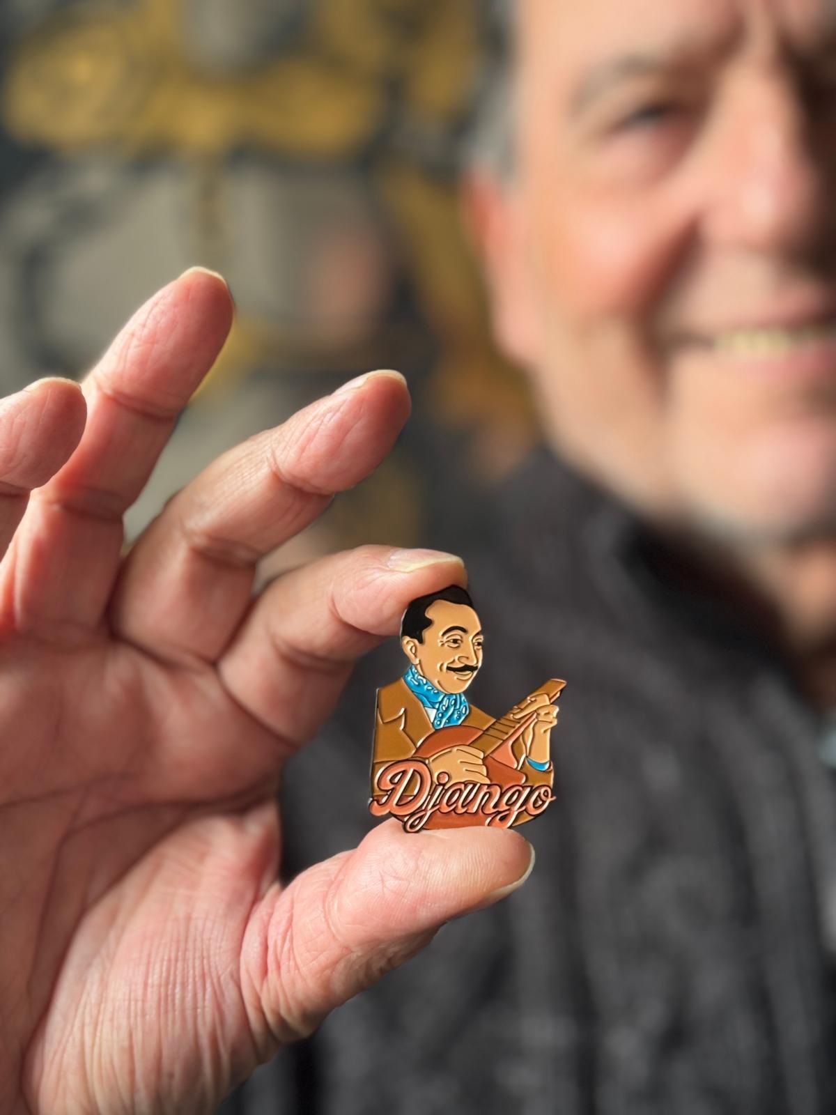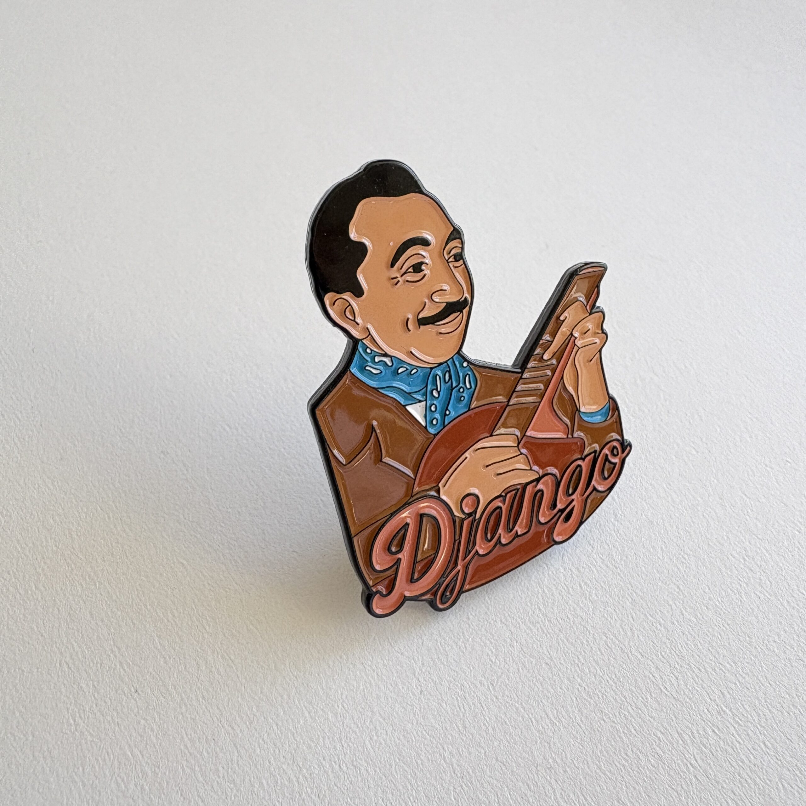 A finely crafted enamel pin honouring Django Reinhardt – guitarist, composer, innovator, and one of the defining figures of 20th-century music.